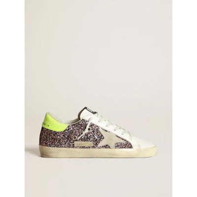 Super-Star sneakers in gray and pink glitter with ice-gray suede star and fluorescent yellow leather
