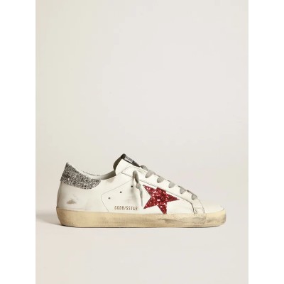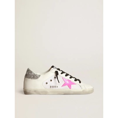 Super-Star sneakers in white leather and canvas with shocking-pink leather star and silver glitter h
