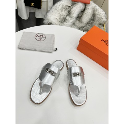 Hermes Slides Silver Leather Women Summer flip flops