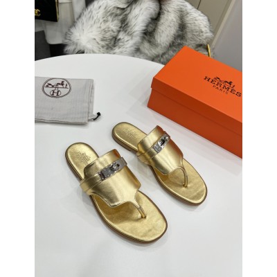 Hermes Slides Gold Leather Women Summer flip flops