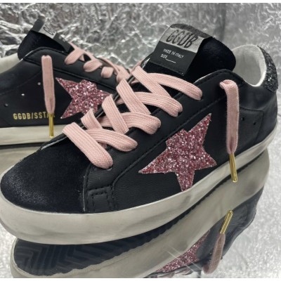 Women's Super-Star Sneakers in black leather with pink sparkle star and black sparkle heel tab