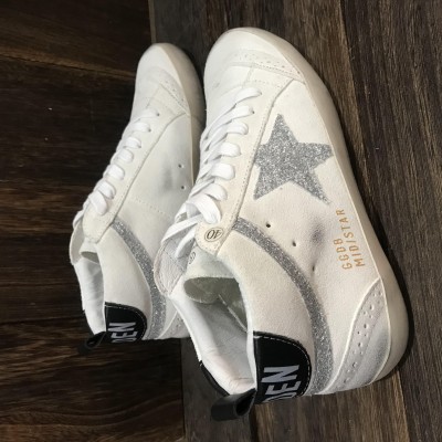 New Season Mid Star Sneaker with gold glitter star and navy blue heel tab
