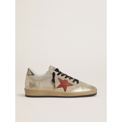 Ball Star in beige suede with red leather star and metallic bronze foiled leather heel tab